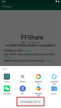 简化流程:只需选择要共享的媒体文件,并使用FFShare进行操作。软件会自动打开界面展示压缩进度,完成后还会出现新的共享对话框,方便直接分享新生成的压缩文件。