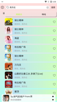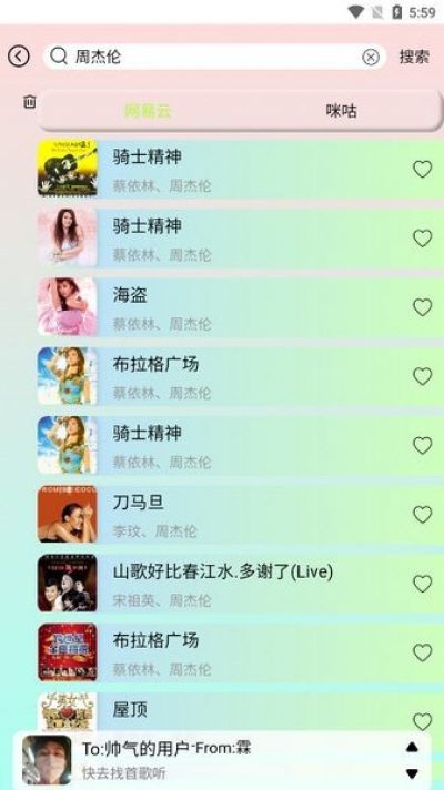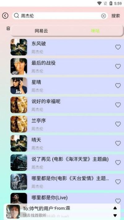 3、例如小编在这里输入“周杰伦”点选搜索后,就会匹配出网易云音乐和咪咕音乐平台的播放资源。