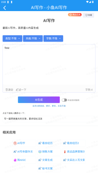 小鱼AI写作app官方版是一款基于人工智能技术的智能写作工具,软件为用户提供高效便捷的写作辅助服务,通过深度学习和自然语言处理技术,帮助用户快速生成高质量的文本内容,适用于多种写作场景,在日常学习工作中都能提供高效的写作支持,帮助用户轻松应对各种写作挑战!