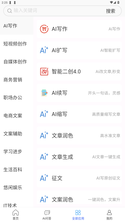 5、进入全部应用页面,这里为大家提供了不同领域的创作功能,可以根据分类选择,也可以输入关键词进行搜索