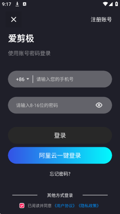 打开app,新用户需要使用手机号注册账号