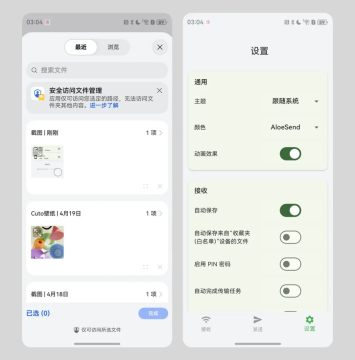 AloeSend 的早期版本名叫 AloeChat.AI,它之前的名字太有迷惑性,以至于第一次在应用市场见它我习惯性将它归入各类 AI 套壳应用放过了。现阶段正在测试中的 AloeSend 则从应用名称到使用体验全方位对齐 LocalSend,实际使用下来和其它平台的 LocalSend 客户端几乎没有差别:它支持发送的类型包括文件、媒体和文本,类型上相比目前 Android 端少了文件夹和应用,但基本也能覆盖大部分日常使用场景;传输方面实测能够与 Android、Windows 版本 LocalSend 客户端正常识别,自动保存、一对多传输、链接分享等扩展功能也一个不落。