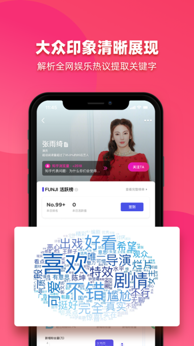 FUNJI是一款总结艺人数据的平台,用户可以在上面看到各个艺人的各种数据,让你可以详细了解你的爱豆流量情况;通过此款软件,粉丝可以了解到自己喜欢的艺人的各种数据表现,并且可以让一些经纪公司或者影视公司对艺人流量有一定的了解。