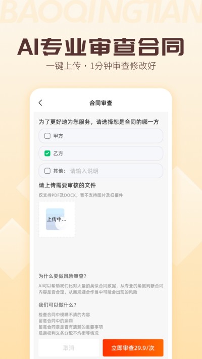 支持多种文档格式一键上传,操作简单快捷,无需复杂流程即可完成合同审查。