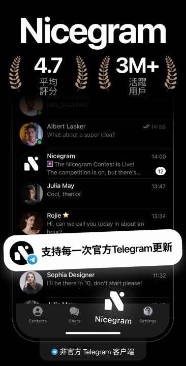 – 通过独特功能升级您的Telegram:秘密聊天、Double Bottom、频道内容下载、聊天中翻译、界面故事隐藏、直接从您的图库发送圆形视频消息等,更多功能请访问Nicegram官网