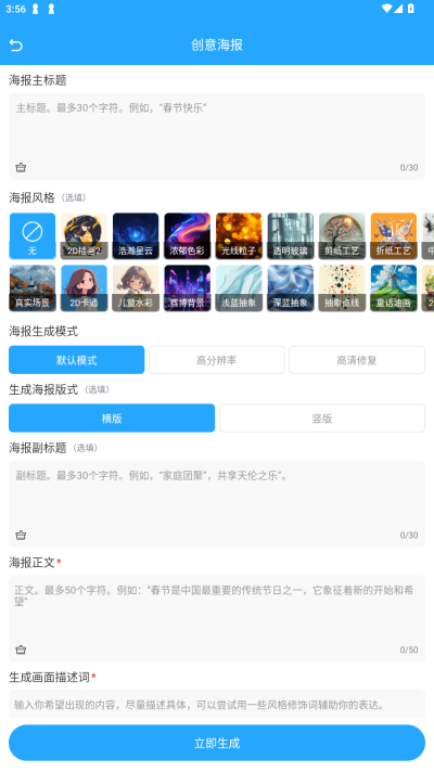 3、点击AI绘画,输入你心中的画面,尽量描述具体,也可以直接引用描述词,点击立即生成即可