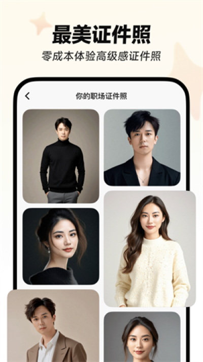 1、证件照拍摄,告别繁琐的拍摄过程,星绘将轻松为您生成专属证件照;一键生成,即时使用,轻松访问同一类型的照片。