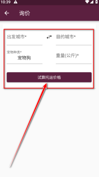2、输入出发城市和目的地城市,再输入宠物种类和重量,最后点击试算托运价格即可。