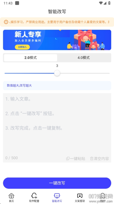 具备5种改写模式,满足不同用户需求,强大的AI智能算法可以智能换词改句,同时集成原创度检查工具,改写完成后可显示原文相似度。