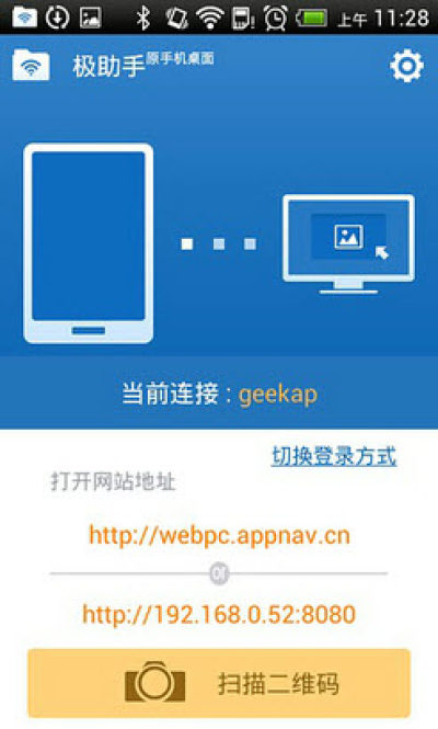 极助手是一个非常不错的无线数据传输工具,只需扫描电脑中的二维码便可以与PC端相连来传输数据文件了,并可以通过电脑中的网页来管理安卓设备,操作简单,功能强大,感兴趣的朋友快来下载体验吧!