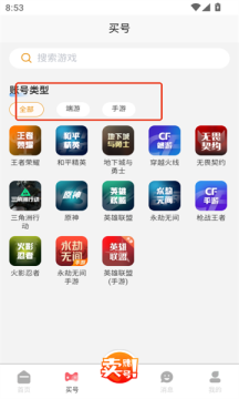 2、在“买号”栏目,你根据自己的需求选择账号类型,端游还是手游,就可以看见下面的详细支持游戏了。
