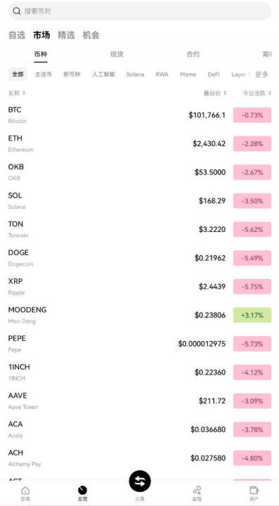 欧易OKEx支持法币、币币、衍生品交易,提供全球领先的投资品类,覆盖157个币种和469个交易对,一站式满足投资者的各种需求。