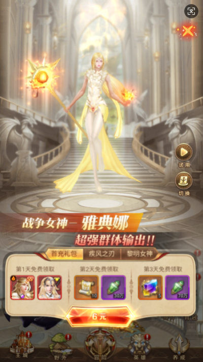 1、第2个英雄就是首充的雅典娜,虽然雅典娜只是2S法师,但英雄强度很高值得培养到后期。首先我们培养她到8星,本体可以购买开服礼包的30 礼包获得,接下来开始推图推塔,推到过336关给个水系3s艾希先放包里如果抽卡没给好的英雄拿出来升级当个炮灰打点伤害也不错,等推不动了我们就开始做做日常,打打活动副本,基本活动副本你都能通过。