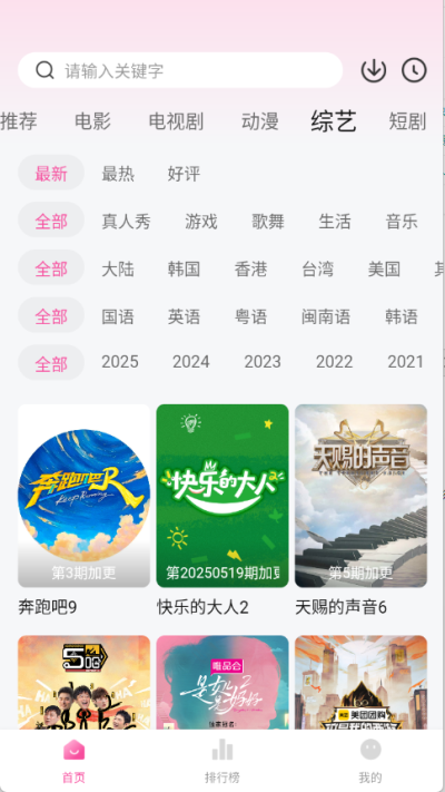 2、首页页面可以看到顶部栏中有很多的影视剧集,包含了电影、电视剧以及综艺等。