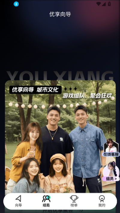 优享向导app是一款安卓手机生活游玩服务平台,多人组局聚会开黑想玩就玩,在这里展示你的个性化主页,找到更合拍的玩乐搭子,让你的生活更有趣!对软件感兴趣的话不妨点击下载试试!