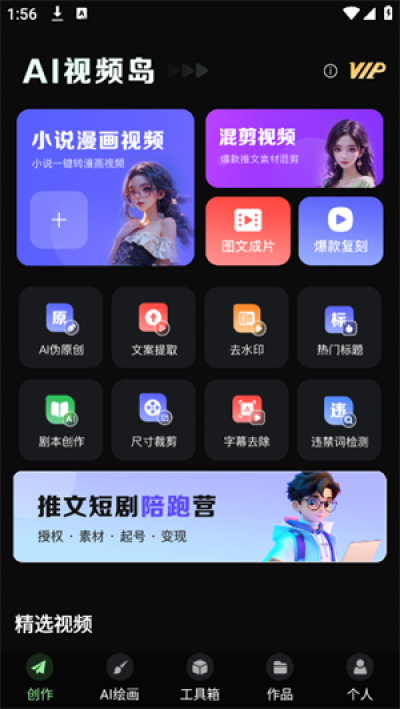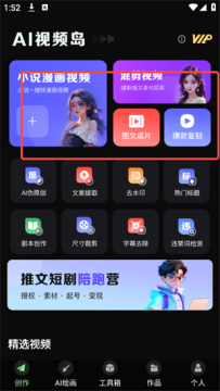 3、在首页中提供了小说漫画视频、混剪视频、爆款复刻、图片成片等创作功能