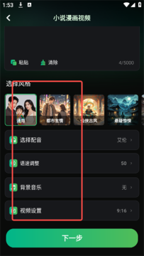 5、完成后选择喜欢的风格、配音、背景音乐等,点击下一步即可制作