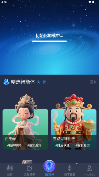 快来宇宙大派队App,无需复杂操作,通过极简界面即可进入神话,历史,非遗景点、古风街市等主题空间,系统基于兴趣标签(如AI虚拟交友,文学,汉服、非遗、神话,历史,古代帝王将相,文人墨客等)实时推荐AI智能体角色,匹配“文化搭子”。
