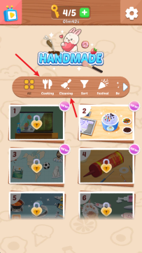 1、进入游戏后,我们可以自由的去选择关卡,上方还有不同类别,例如烹饪、清洁等等。
