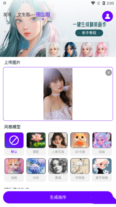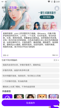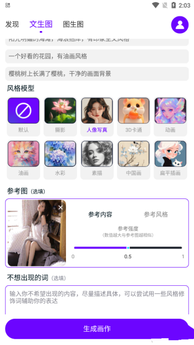 3、点击文生图,输入你心中的画面,选择自己喜欢的风格模型、图片比例、辅助描述等,点击生成画作即可