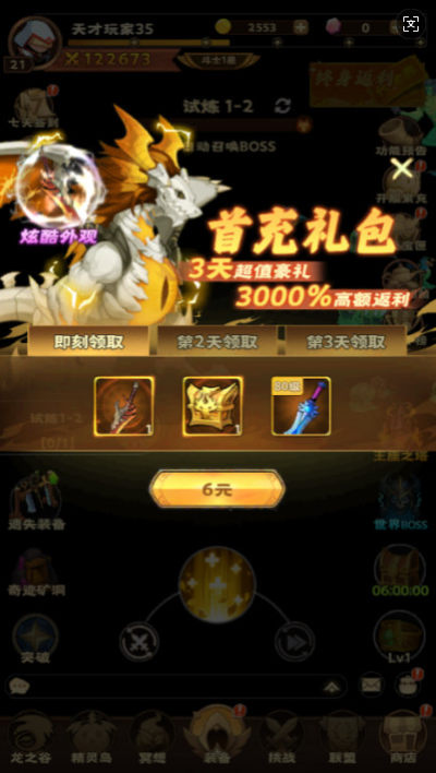 2、到了首充环节,这里不用慌,利用游戏内天天赠送的648元代金券,可以白嫖购买首充所有档位,所有道具直接免费拿,时装幻化都是,免费入手的。购买首充后游戏整体体验会更加流畅,可以毫不费力的通过当前试炼关卡