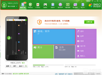 3.当360手机助手界面左上角出现,mibox等字样,说明连接成功,并选择游戏、软件选项;如下图