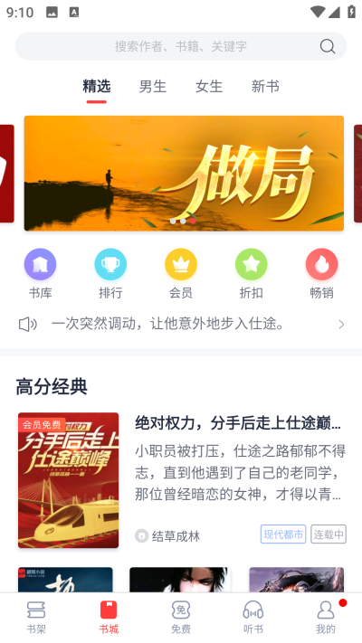 2、进入“听书”功能界面,通过浏览或搜索找到心仪的小说,打开其阅读页面,点击“立即播放”按钮,即可开启听书体验。