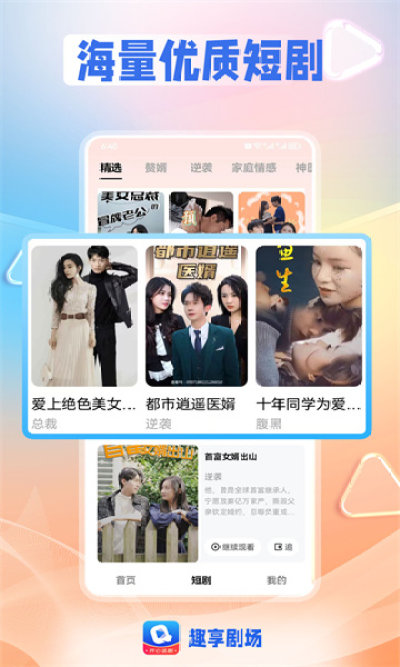 趣享剧场app是一款安卓手机免费看短剧的平台,用户可以随时随地轻松看短剧,不同类型的短剧满足你的追剧所需,即点即看非常方便,还可以通过筛选关键词的方式找到心仪的短剧!对软件感兴趣的话不妨点击下载试试!