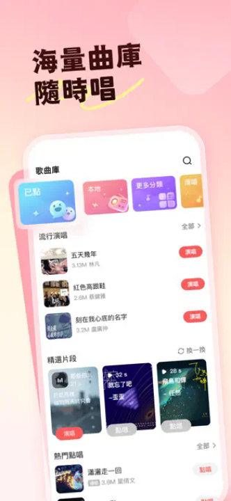 清唱五分钟-自由嗨唱模式,录制弹唱翻唱歌曲展示才艺,演唱kkbox、mixerbox mb3歌曲yt line music