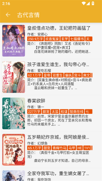 桔子阅读器提供了丰富的小说资源,涵盖多种热门类型,如言情、悬疑、科幻、历史、仙侠武侠等,满足不同用户的阅读偏好。
