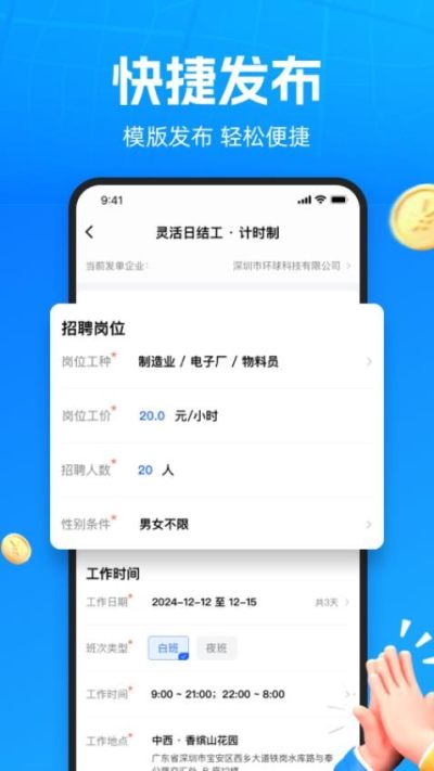 灵活用工,按需招聘: 轻松发布日结灵活用工岗位(制造业工厂、物流等),满足企业短期、临时、季节性用工需求,有效控制人力成本。