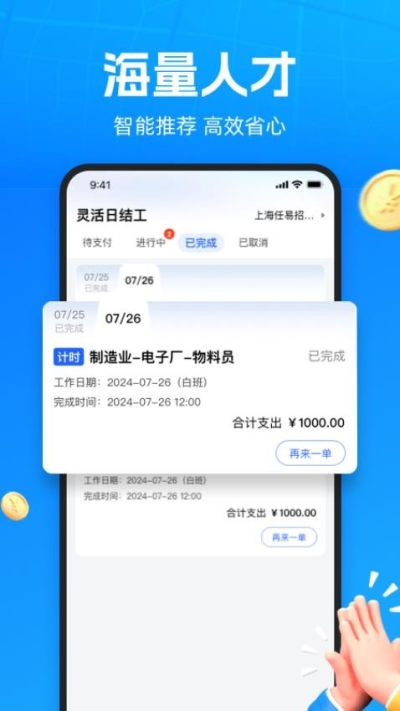 详细的历史用工订单信息,知道待支付、进行中、已完成和已取消等订单更方便;