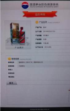 2.将手机正背后的NFC感应区对准茅台的RFID瓶标位置,“嘀”的一声后,停留片刻,如果查询成功则显示如下图类似页面: