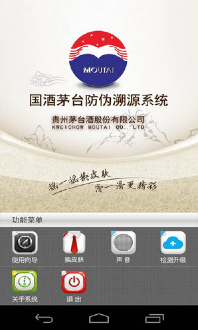 1.直接将手机正背后的NFC感应区对准茅台的RFID瓶标位置,此时会自动跳出“国酒茅台防伪溯源系统”,或点击桌面或应用程序里面的茅台防伪溯源应用程序,也会出现“国酒茅台防伪溯源系统”,如下图: