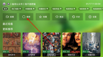 3、点击箭头所指的搜索,输入关键词精准检索喜欢观看的电视频道