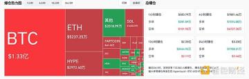 Coinglass数据显示,过去24小时全网爆仓3.23亿美元,其中多单爆仓7708.31万美元,空单爆仓2.46亿美元,BTC爆仓1.33亿美元,ETH爆仓5,237.25万美元,SOL爆仓1,620.07万美元。过去24小时,全网共有112,363人被爆仓,最大单笔爆仓单发生在Hyperliquid-BTC-USD,价值1,457.87万美元。