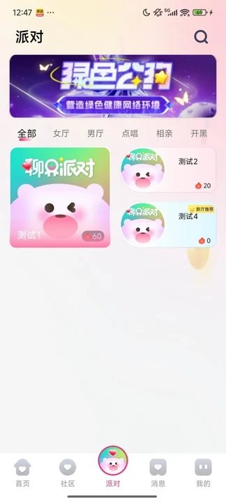 1、派对分类细致,点唱、相亲、开黑等场景精准匹配兴趣,让用户快速找到同好。