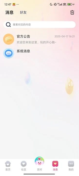 3、官方公告、系统消息简洁友好,派对主题传递绿色理念,在社交中融入正向运营。