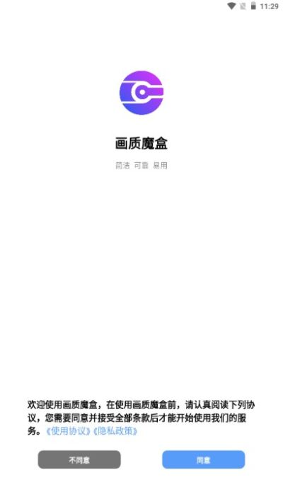 1、先在本站下载最新版本的画质魔盒专业版app安装到手机上,第一次进入软件需要查看用户隐私协议,点同意进入。