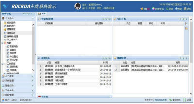 ROCKOA使用敏捷Ext前端开发框架,支持多种模块分布式开发,统一布局,界面简洁不失严肃。其功能包含有个人办公、工作流、人力资源、行政办公、员 工档案、用户管理等,含盖60多个功能点,适合于企业领域内若干规范和要求,构成高性能、高可用、高质量、底成本的信息化管理平台。