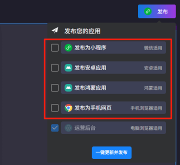 实际上,码上飞不止能一键发布鸿蒙应用,发布为小程序、安卓应用、H5网页也同样适用。