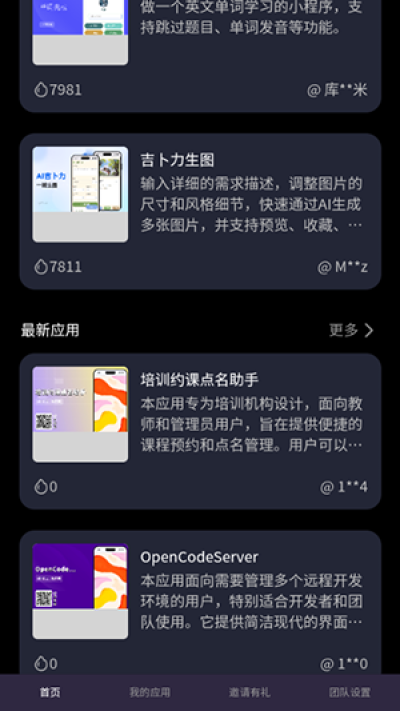 我们进入码上飞平台,首页有非常多的应用开发案例,可以直接查看开发的对话全过程和最终效果。