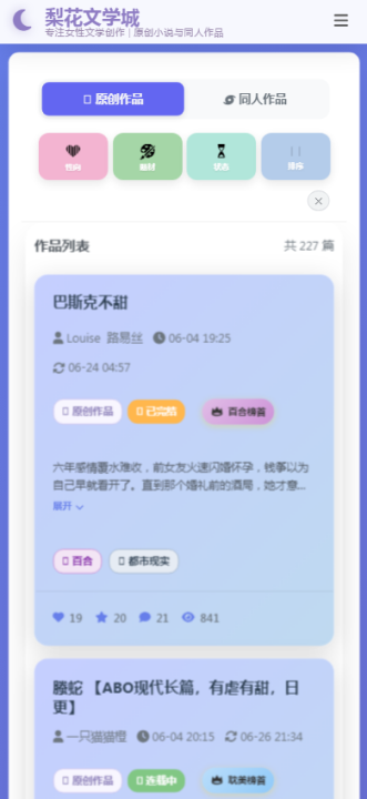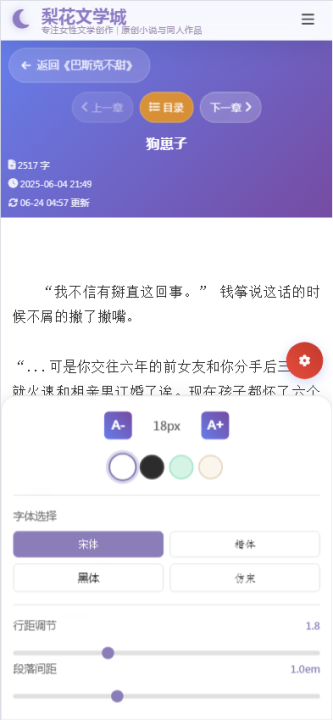 梨花文学城app是一款手机阅读平台,专注女性文学创作,在这里可以阅读或者发布原创小说与同人作品,还可以根据完结状态以及小说题材等进行快捷筛选浏览,自定义阅读背景以及字体大小,对软件感兴趣的话不妨点击下载试试吧!