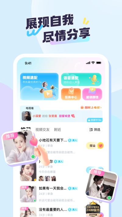 来语恋遇见Ta,邂逅缘分,语恋是首个「沉浸式视频恋爱社区」,通过视频交友互动认识,在趣味聊天中自然升温关系。在这里,每一场对话都是双向奔赴的起点,每一次眼神交汇都可能触发爱情代码。