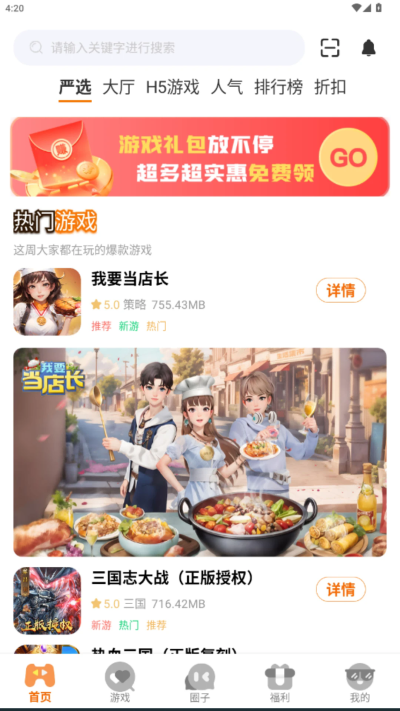 2、进入到软件首页,如图所示。这里已经为大家推荐了一些热门的游戏内容,大家可以直接点击进入体验。
