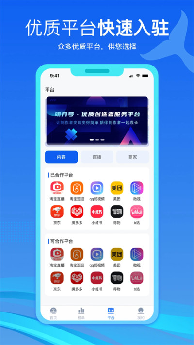 让创作者的变现变的简单,陪伴创作者一起成长。 明月号创作者中心系统是一款专为短视频和直播达人设计的综合性管理平台,旨在提供一站式服务,帮助达人与明月号创作者中心合作、孵化创意、管理内容以及获取收益。该系统整合了各种功能模块,使达人能够更便捷地与公司互动,实现内容创作与商业化的无缝连接。