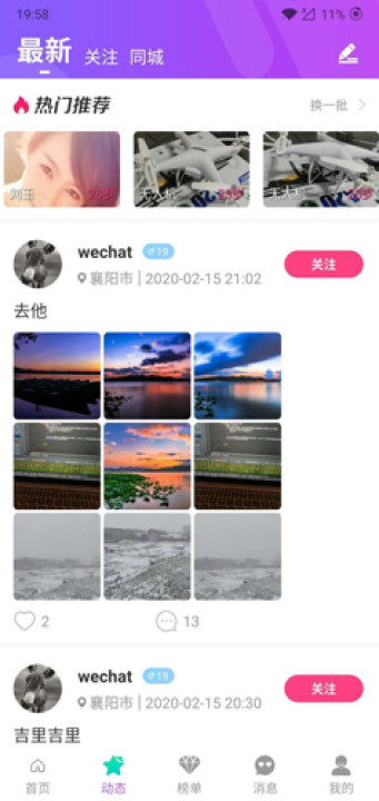 4、在动态界面中,用户可浏览到各式各样的动态消息