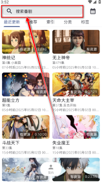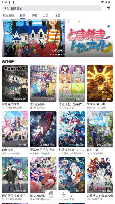 1.打开AniCh动漫App,可以看到首页上方有着最新的最近更新、推荐、索引、分类等板块内容
