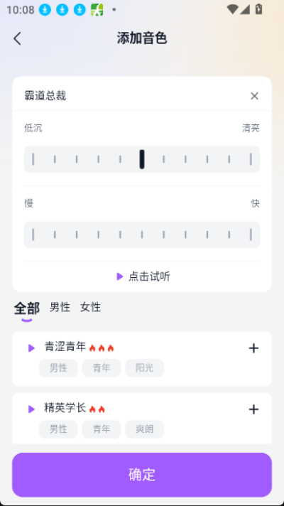 混合音色库:内置50+基础音色(清冷御姐、软萌正太、慵懒大叔等),支持音调、语速、呼吸声强度三档调节;