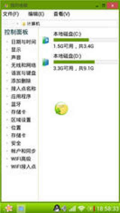 和电脑一样,点击坐下角的开始按钮,会出现程序菜单,大家看一下是不是和电脑一样呢?在手机桌面会出现我的电脑、控制面板、回收站等等也电脑一样的应用,而且功能也是一样的。控制面板提供用户中心、任务中心、主题中心、桌面设置、系统设置、语言设置、时间设置及切换到android等等。在我的电脑界面会出现C盘和D盘,C盘就是手机自带内存。D盘就是存储卡内存。和电脑是一模一样的。